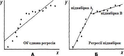Припустимо, що є дані тимчасового ряду по двох змінним і що в період вибірки відбулася структурна зміна, що розділяє спостереження на підвибірки А і В. На мал. Б регресії для підвибірок забезпечують цілком адекватну відповідність даним, обумовлюючи низькі значення UA і UB . Якби потрібно було оцінити об'єднану регресію, як на мал. А, то залишки в обох підвибірках в цілому були б значно більше.