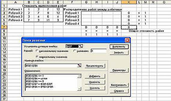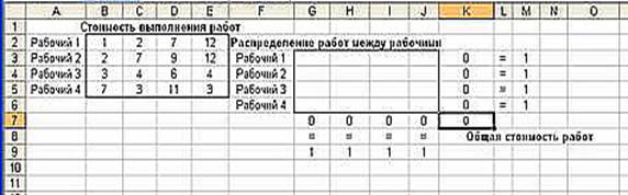 В этой таблице строки соответствуют рабочим, а столбцы — работам. Необходимо составить план выполнения работ так, чтобы все работы были выполнены, каждый рабочий был загружен только на одной работе, а суммарная стоимость выполнения всех работ была минимальной. Отметим, что данная задача является сбалансированной, т. е. число работ совпадает с числом рабочих. Если задача не сбалансирована, то перед началом решения ее необходимо сбалансировать, введя недостающее число фиктивных строчек или столбцов с достаточно большими штрафными стоимостями работ.