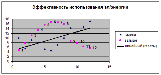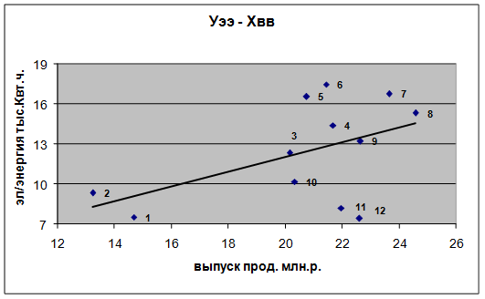 - График модели (1) представлен на рисунке 1. Линия графика разделяет режимы работы предприятия на две группы (кластера). Точки на рисунке, расположенные ниже линии, соответствуют режимам работы предприятия в январе, июне, сентябре, октябре, ноябре и декабре и характеризуются более экономичным использованием электроэнергии по сравнению с остальными режимами.