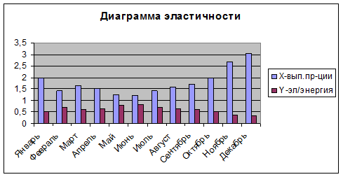 Для расчета оценок эластичности по месяцам года умножим значения соответствующих ресурсоемкостей на значения предельной электроемкости для каждой однофакторной модели. Как следует из диаграммы, эластичность наибольшая в феврале и наименьшая в апреле, что соответствует наименьшему и наибольшему выпуску продукции. Следовательно, управлять расходом электроэнергии целесообразно при меньших объемах выпускаемой продукции.