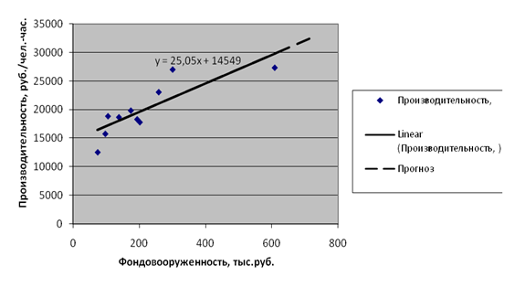 Из графика следует, что в прогнозируемом периоде производительность будет увеличиваться, т.к. имеет возрастающий тренд и производительность составит 30330,56 руб./ чел.-час. при коэффициенте фондовооруженности равного 630.