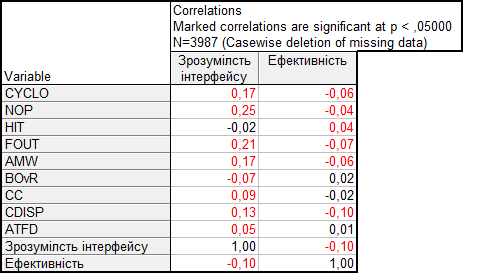 При проведенні кореляційного аналізу було за допомогою пакету Statisticaобчислено коефіцієнти для пар метрика-експертна оцінка.