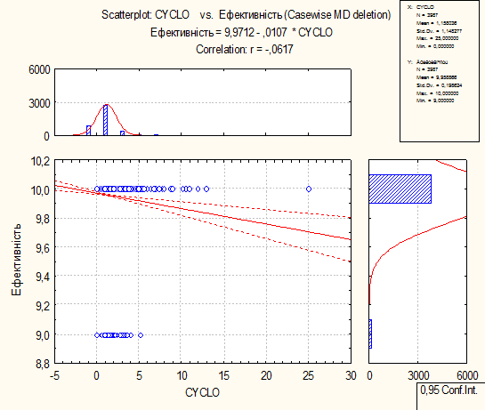 7. Регресійний аналіз з побудованими лініями регресій, визначеними функціями регресій, коефіцієнтами у функціях та перевірками
