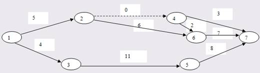 В сетевом графике имеется два основных элемента – работа и событие. Работы соответствуют дугам графа, а события – вершинам. Работами называются любые процессы, действия, приводящие к достижению определенных результатов (событий). В сетевом графике может быть несколько разновидностей работ: действительная работа, ожидание, фиктивная работа. Действительной называется работа, требующая затрат времени и ресурсов. Ожиданием называется работа, которая требует затрат времени, но требует затрат ресурсов. Фиктивная работа отражает логическую связь между работами и не требует затрат времени и ресурсов. Действительные работы и ожидания изображаются на графике сплошными стрелками, фиктивные работы – пунктирными стрелками. Количественные показатели (время, стоимость, ресурсы), характеризующие работу, проставляются над стрелками (рис.2).