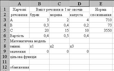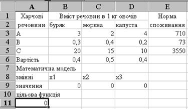 Набути навичок складання математичної моделі задачі складання сумішей (раціону) та її реалізації з використанням табличного процесору Excel