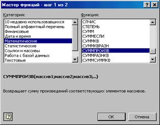 а) необхідно клацнути у комірці А11 і вибрати пункт меню Вставка\Функция та у вікні майстра функцій вибрати категорію функцій Математические та функцію СУММПРОИЗВ: