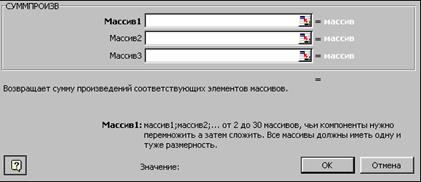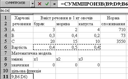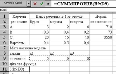 б) далі у діалоговому вікні функції СУММПРОИЗВ () у рядку Массив 1 увести адресу блоку комірок із значеннями змінних (B9: D9) і натиснути клавішу Enter потім у рядку Массив2 виділити блок комірок із значенням вартості овочів(B6: D6) після цього у комірці А11 з'явиться результат попереднього розрахунку – 0