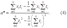 где a и b – параметры, неизвестные статистику и подлежащие оцениванию, а ek – погрешности, искажающие зависимость. Среднее арифметическое моментов времени