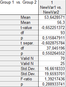 - t-separ– расчетное значение t‑критерия с учетом различных дисперсий. Очевидно, что в этом примере оно не изменяется, однако программа выдаёт другой результат.
