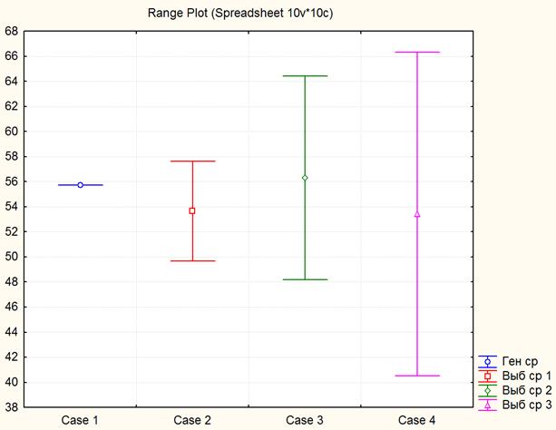 Диаграмма наглядно демонстрирует возможный результат выборочного зондирования исследуемой генеральной совокупности и убедительно иллюстрирует объективную неоднозначность выводов, формулируемых на основе выборочных данных.