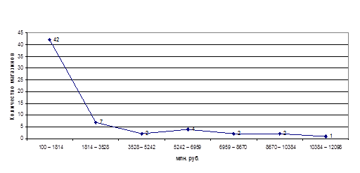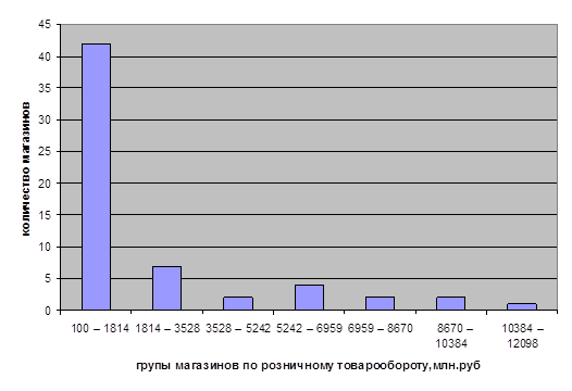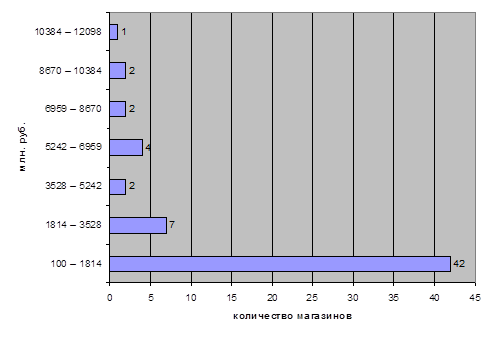 Группировка магазинов по розничному товарообороту, (млн. руб.).