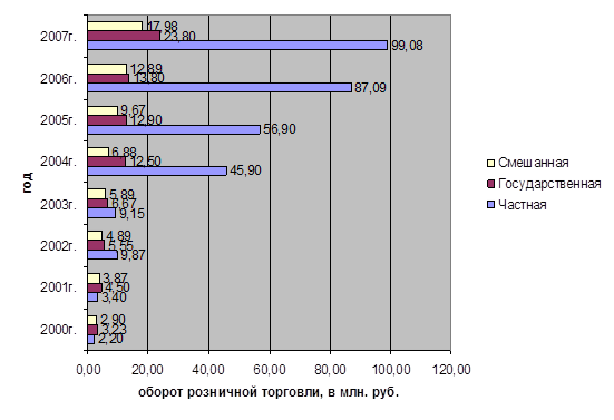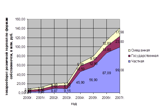 Таблица 1.4. Группировка оборота розничной торговли по формам собственности, (млн. руб).
