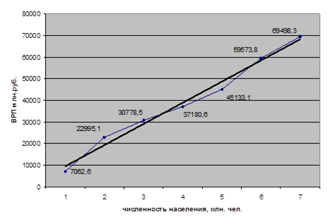 Построим график зависимости ВРП от числа населения в регионе: