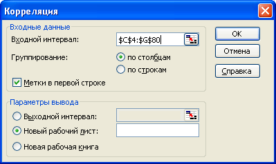 1.С помощью надстройки «Анализ данных … Корреляция » строим матрицу парных коэффициентов корреляции между всеми исследуемыми переменными (меню «Сервис » ® «Анализ данных …» ® «Корреляция »). На рис. 1 изображена панель корреляционного анализа с заполненными полями[1] . Результаты корреляционного анализа приведены в прил. 2 и перенесены в табл. 1 .