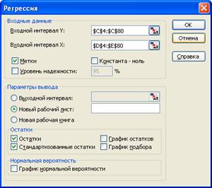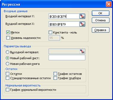 Для построения уравнения регрессии скопируем на чистый рабочий лист значения используемых переменных (прил. 5) и проведем регрессионный анализ (рис. 3 ). Его результаты приведены в прил. 6 и перенесены в табл. 3 . Уравнение регрессии имеет вид: