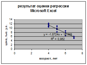На основе поля рассеяния, построенного на основе табл. 1, выдвигаем гипотезу о том, что зависимость цены y от возрастаавтомобиля x1 описывается линейной моделью вида