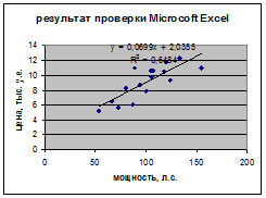 Аналогично, на основе анализа поля рассеяния (рис. 2), также построенного на основе таблицы 1, выдвигаем гипотезу о том, что зависимость цены y от мощности автомобиля x2 описывается линейной моделью вида