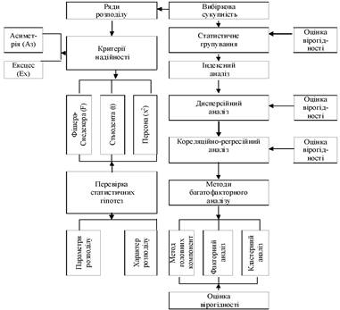 Аналіз складної економічної моделі може бути вірогідним лише за умов поєднання різних методів статистики. Якщо виходити з концепції випадковості формування економічної інформації, її дослідження повинно здійснюватися за такою послідовною схемою статистичного аналізу: на першому етапі визначають основні статистичні оцінки рядів розподілу - середні (арифметична, мода, медіана), показники варіації, перевіряють відповідність характеру розподілу нормальному закону (Гауса-Лапласа). Такі розрахунки дають можливість з'ясувати, наскільки вибіркова середня буде відповідати її значенню у генеральній (досліджуваній) сукупності при різних можливих варіантах відомої і невідомої дисперсії у досліджуваній сукупності. Статистичні методи можуть використовуватись для підготовки вхідної інформації для оптимізаційних моделей. При застосуванні статистичних методів найбільш надійні результати одержуються при коротко- і середньо-терміновому прогнозуванні.