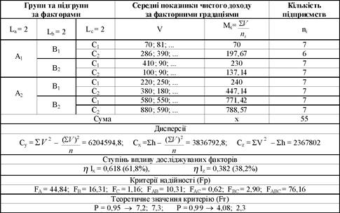 В основу розрахунку такого комплексу покладено комбінаційне групування 55 досліджуваних сільськогосподарських підприємств Полтавського регіону. Одержані кількісні характеристики дисперсійного аналізу орієнтують на наступні висновки: