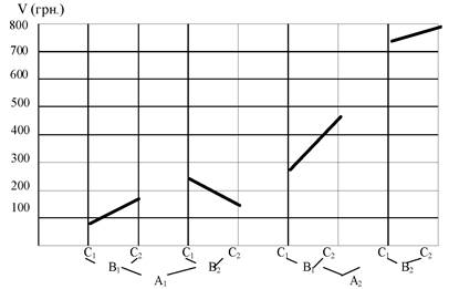 Найбільш сильний вплив на чистий прибуток справив фактор А (г|2 А = 36,4%), про що свідчить, зокрема, основний ряд окремих середніх М . Він однаково діяв при всіх градаціях факторів В і С: при А1 рівень отриманого чистого прибутку був порівняно низький; при А2 - підвищився (рис. 2).