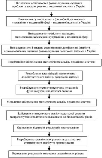 Наукове дослідження питань щодо ефективного реформування та побудови раціональної податкової системи в Україні неможливе без відповідного статистичного забезпечення управлінських рішень, спрямованих на оптимізацію оподаткування. Національна податкова система характеризується високим рівнем складності явищ і процесів, що їй притаманні . Це пояснюється великою кількістю елементів системи, які взаємодіють між собою та з елементами інших систем. Такі явища і процеси є масовими. Проводити дослідження та оцінювати динамічні зміни масових явищ і процесів, а також взаємозв'язків між ними можливо шляхом системного підходу із використанням статистичних методів. Таким чином, слід зазначити, що основне завдання статистичного забезпечення управлінських рішень щодо вдосконалення податкової системи полягає у дослідженні за допомогою статистичних методів та моделей кількісних відношень масових явищ і процесів, що пов'язані з функціонуванням податкової системи, у зв'язку з їх якісним асчпектом. Кількісно-якісну характеристику масових соціально-економічних явищ і процесів відображає система статистичних показників, за допомогою якої реалізуються основні принципи статистичного підходу до вдосконалення податкової системи. Тому методичне забезпечення є важливою складовою статистичного забезпечення управління у сфері оподаткування. Ще однією не менш важливою складовою статистичного забезпечення управління є формування інформаційного забезпечення, а саме: збирання, зберігання, оброблення та передача інформації. Ефективність функціонування податкової системи значною мірою залежить від рівня організації інформаційних процесів, актуальності та своєчасності отримання інформації, її повноти і достовірності, значущості показників. Наукове обґрунтування управління у податковій сфері передбачає обов'язкове виконання попередніх (підготовчих) етапів, які забезпечать прийняття адекватних та ефективних управлінських рішень, а також своєчасну їх реалізацію. Це, по-перше, пізнання економічних законів і особливостей їх дії в даних конкретних умовах функціонування податкової системи в Україні; подруге, використання статистичного інформаційного та методичного забезпечення для наукового аналізу особливостей національної податкової системи; по-третє, використання відповідного технічного забезпечення для своєчасного здобуття, оброблення та ефективного використання інформаційної бази, а також підготовка кваліфікованих кадрів для практичного застосування прогресивних наукових розробок. Таким чином, процес розроблення статистичного забезпечення управлінських рішень щодо вдосконалення податкової системи в Україні можна розкласти на певні етапи або складові частини (рис. 2). Для забезпечення ефективності управління повинно бути організовано безперервний процес формування його статистичного забезпечення з метою постійного вдосконалення управління відповідно до динаміки статистичних показників соціально-економічного розвитку. Збагачення методології статистичного дослідження особливостей функціонування податкової системи відбувається шляхом застосування на практиці сучасних статистичних методів і моделей.