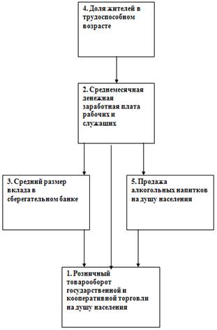 Средний размер вклада в сберегательном банке и продажа алкогольных напитков на душу населения, в свою очередь, влияют на розничный товарооборот государственной и кооперативно торговли на душу населения.