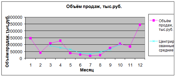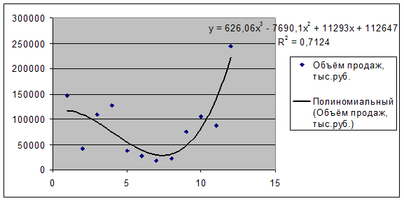 При отсутствии влияния со стороны факторных признаков, учтённых в данной модели, значение результативного признака будет составлять – 35448,930 тыс.руб. При изменении собственных цен на 1 тыс.руб. произойдёт изменение объёма продаж в ту же сторону на 7929,866 тыс.руб., а при изменении цен конкурентов на 1 тыс.руб. следует ожидать изменение объёма продаж на 94,305 тыс.руб.