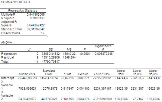 Для определения уравнения регрессии необходимо сделать вспомогательные расчёты. В результате проведения дополнительных расчётов и решения системы нормальных уравнений получились следующие коэффициенты регрессии: