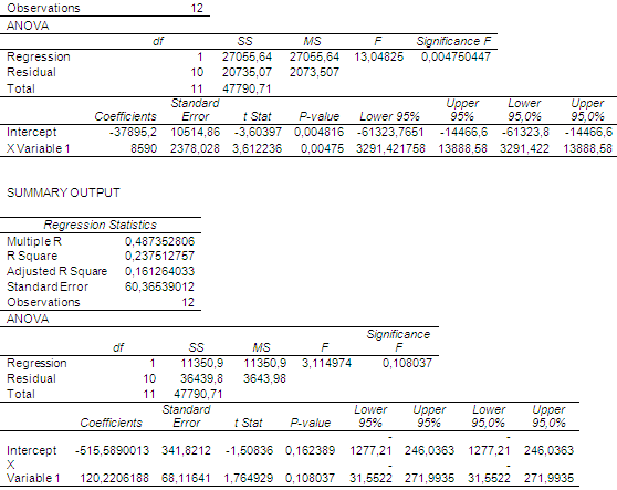 C помощью пакета анализа данных, я сравнила Y (объём продаж, тыс.руб.) и X1 (цена принтера, тыс.руб.) и получила следующее: