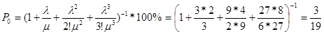 г) определить основные параметры, характеризующие ее работу (вероятность отказа, относительную пропускную способность, абсолютную пропускную способность, вероятность того, что все каналы заняты, вероятность наличия очереди, среднее число заявок в СМО, среднее число занятых каналов);