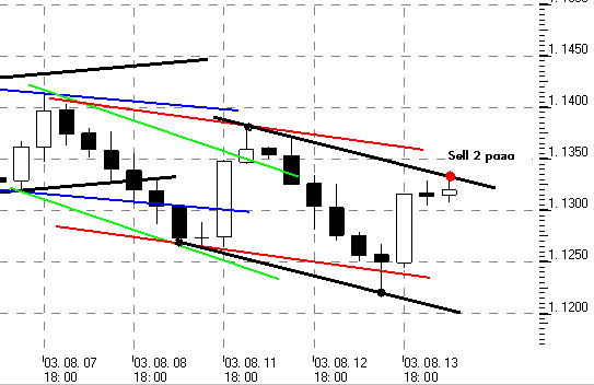 Но очень важный момент, на собственном опыте хочу предостеречь читателей рассылки. Пока сделка не закрыта, не открывать новую, даже если цена дошла до границы канала. Я думал схитрить. Если цена пойдет обратно, я дескать закрою первую позицию на обратном откате, а вторая уже будет давать прибыль. Фигушки. Два раза я так сделал. В итоге цена проскакивала границу. У меня открыты две позиции в противоположном направлении, я, конечно, ничего не теряю при этом, но и не получаю. Т.е. за два раза я упустил прибыль в размере 120 пунктов, потому что естественно меня закрывало по переворотному стопу.
