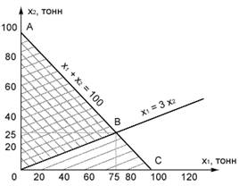 Внаслідок позитивних значень x1 і x2 (x1 ≥ 0; x2 ≥ 0) роз’вязання варто шукати в першому квадранті. Обмеження за сумарним випуском (x1 + x2 ≤ 100) звужує область пошуку до трикутника ОАС, який знаходиться всередині обмеженого зверху прямою x1 + x2 = 100. Обмеження x1 ≤ 3 x2 ще більш звужує область припустимих за умовою задачі значень x1 і x2, укладаючи її в трикутник ОАВ, обмежений знизу прямою x1 ≤ 3 x2. Серед усіх значень x1 і x2, ув'язнених всередині ОАВ, оптимальним відповідає тока В. У цій точці, що відповідає координатам x1 = 75; x2 = 25, досягається найбільше з припустимих значень x1, рівне 75. До найбільшого ж значення x1 і треба прагнути, тому що перший вид продукції дає у розрахунку на одну тонну більше прибутку, ніж другий (12 > 8), тобто треба вибирати найбільше з можливих, припустимих значень x1. Оптимальному роз’вязанню відповідає, таким чином, точка B, у якій цільова функція досягає свого максимального значення