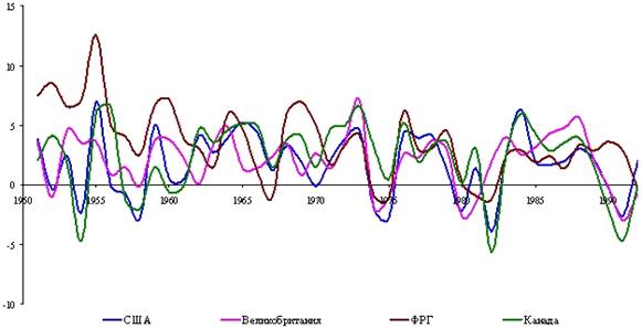 Рис. 1 Годовые темпы прироста ВВП США, Великобритании, ФРГ и Канады в 1951-1992 гг. (%%)