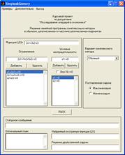 Итогом написания данной курсовой работы является компьютерная реализация решения линейных программ симплексным методом в обычном, целочисленном и частично целочисленном вариантах.