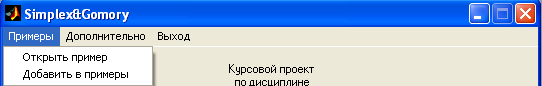 Пункт «Примеры» позволяет загрузить или создать пример работы с программой. Примеры хранятся в текстовых файлах с расширением «matex» содержащих целевую функцию, ограничения и условия неотрицательности.