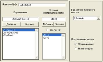 Для ввода функции, ограничений, условий неотрицательности и выбора метода используется центральная часть формы (Рисунок 5).