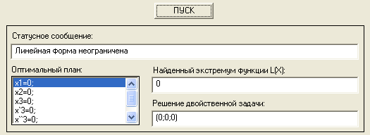 Особое внимание надо обратить на статусное сообщение. Поля «Оптимальный план» и «Экстремум функции» будут заполнены последними значениями, но судить об их верности можно только прочитав статусное сообщение! Решение двойственной задачи отображается только для обычного варианта симплексного метода.