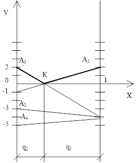 Дана игра 4 х 2 , то есть у игрока А имеется 4 стратегии, а у игрока В – 2. Поэтому, будем решать игру для игрока В. Построим оси: ОХ – на ней будем отмечать вероятности, с которыми игрок использует ту или иную стратегии, и ОУ – на ней будем откладывать цену игры. На расстоянии единица от оси ОУ проведем еще ось параллельную ей, как показано на рисунке 1.