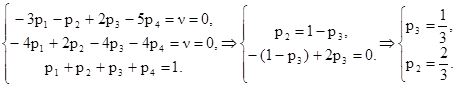 Для игрока А, стратегии А1 и А4 будут не активными, игроку А не выгодно их использовать. Максимально возможный выигрыш, равный цене игры ν = 0, игрок А будет получать, используя стратегии А2 и А3 . Найдем оптимальную смешанную стратегию для игрока А из следующей системы, учитывая, что А1 и А4 не активные стратегии, то есть р1 = р4 = 0: