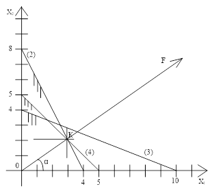 Максимально возможная прибыль из графического решения в точке К, координаты которой находим из системы: