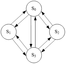 Система может находиться в четырех состояниях, так как у каждого аппарата по продаже билетов есть два состояния (быть занятым или свободным). Пусть S0 – оба аппарата заняты; S1 – 1-ый занят, 2-ой свободен; S2 – 1-ый свободен, 2-ой занят; S3 – оба аппарата свободны. Построим граф состояний, отметив на нем все возможные состояния кругами, а возможные переходы из состояния в состояние обозначим стрелками. Получаем, что переход из S0 в S3 возможен либо через S1 , либо через S2 , либо напрямик, как показано на рисунке 4.