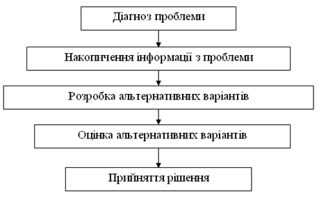 Виявлення проблемної ситуації являє собою перший етап процесу прийняття рішень. Процес прийняття управлінських рішень з урахуванням фактору часу складається з наступних етапів, котрі зображенні на рисунку 1.2.