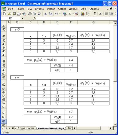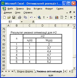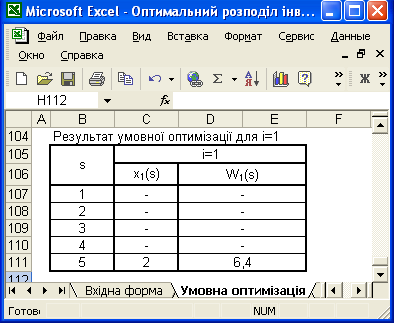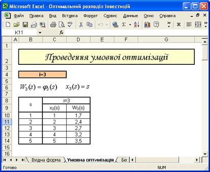 Для проведення умовної оптимізації заповнюються допоміжні таблиці 3.3–3.7, котрі відповідають різним значенням