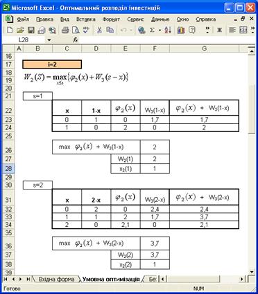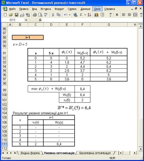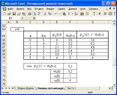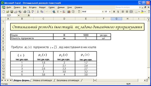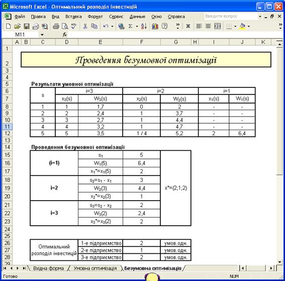 Вхідні умови зображені на рисунку А.1 (Додаток А). Для простоти у задачі зроблено припущення, що вкладаються тільки тисячі умовних одиниць. Проводиться умовна оптимізація. По її результатам заповнюється таблиця 3.2.