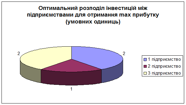Таким чином, для отримання максимального прибутку у розмірі 6400 умовних одиниць, необхідно по 2000 умовні одиниці вкласти в перше і третє підприємства і 1000 умовну одиницю – у друге підприємство. Графічно це відображено на графіку В.1 у додатку В.