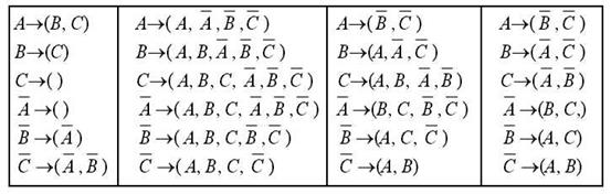В четвертой колонке воспроизводятся записи третьей колонки, но при этом из правой части этих записей исключаются предикаты, образующие в совокупности с субъектом суждения, обратные тем, которые содержатся в CT-замыкании. Например, во второй строке из записи B®(A,