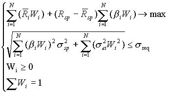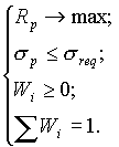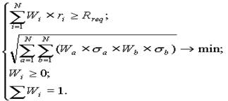 Нехай маємо справу з портфелем цінних паперів, доходність яких відома за минулі 12 місяців, а дисперсію та коваріацію, які є оцінками ризику, потрібно знайти виходячи із заданої статистики доходності цінних паперів і визначити значення оптимального портфелю, яке забезпечить максимальний дохід. Тобто необхідно знайти такий план інвестування (портфель), щоб загальний дохід складав: