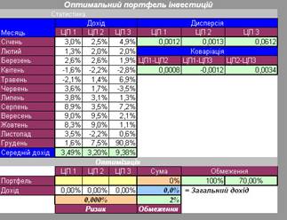 Середній дохід зазвичай обраховується за допомогою функції Excel СРЗНАЧ(Діапазон), варіація (дисперсія) – за допомогою функції ДИСП(Діапазон), а коваріація – функцією КОВАР(Діапазон 1; Діапазон 2). Маючи значення варіації трьох цінних паперів і коваріацій, можна визначити значення ризику. В цільову комірку було введено формулу суми за доходом з кожного цінного паперу.