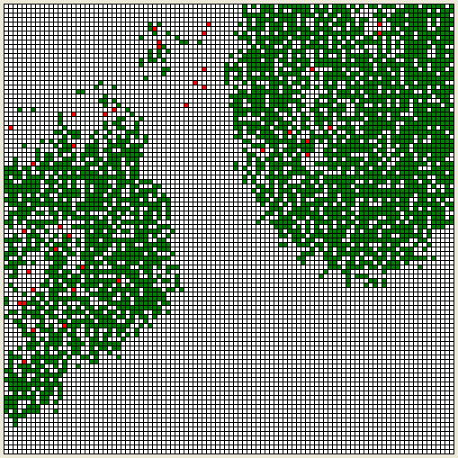 Описанная нами модель очень хорошо согласуется с теорией, но в отличие от аналитических решений она позволяет ещё и посмотреть, как будут вести себя отдельные сообщества, а также как будут распределены хищники и жертвы по площади.