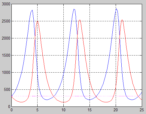 В нашей модели наблюдается похожее запаздывание мах численности хищников от мах численности жертв.